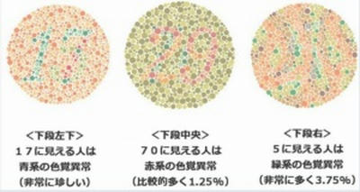 おそらく、左の円の中には数字の「15」、真ん中の円の中には数字の「29」と書いてあるように見える人がいるのではないだろうか?このように見える人は、無事正常な色覚を有していることになる。それでは、一番右の円の中にはなんて書いてあるように見えるだろうか?もしかすると数字の「5」が見える人がいるかもしれない。