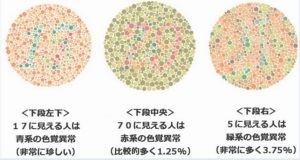 おそらく、左の円の中には数字の「15」、真ん中の円の中には数字の「29」と書いてあるように見える人がいるのではないだろうか?このように見える人は、無事正常な色覚を有していることになる。それでは、一番右の円の中にはなんて書いてあるように見えるだろうか?もしかすると数字の「5」が見える人がいるかもしれない。