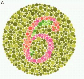 こちらの画像の場合、色盲ではない人には「6」が書いてあるように見え、「5」が書いてあるように見える人は色盲の恐れがあるので要注意である。簡単な検査だが、確実に色盲かどうかを判定することができるとされている。